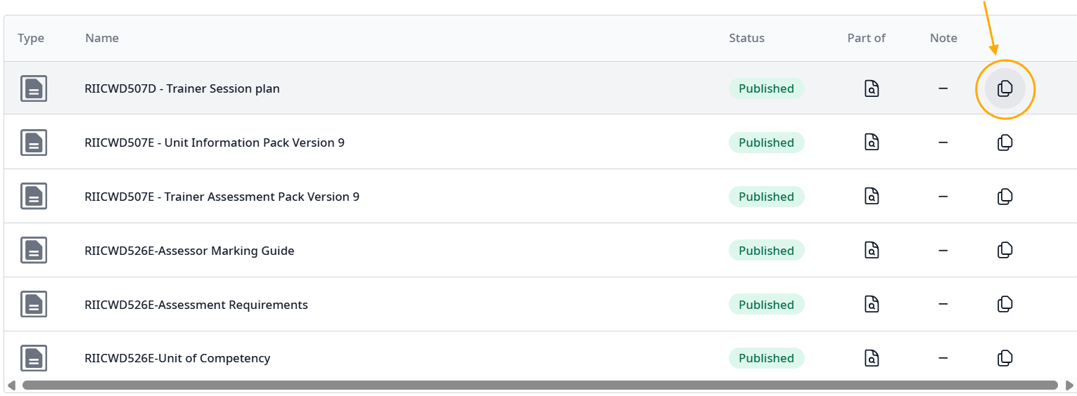 - Click the Duplicate icon (overlapping squares) on the content item row