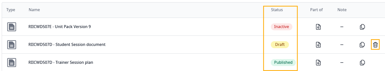- Draft content: Can be deleted permanently using the delete icon (bin)