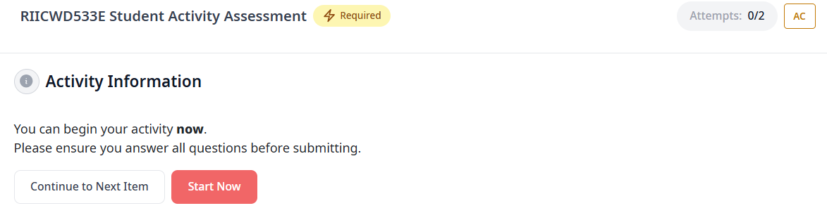When first assigned to a student, an assessment shows AC (Awaiting Completion) status. The student can view the assessment details but hasn't yet started working on it.