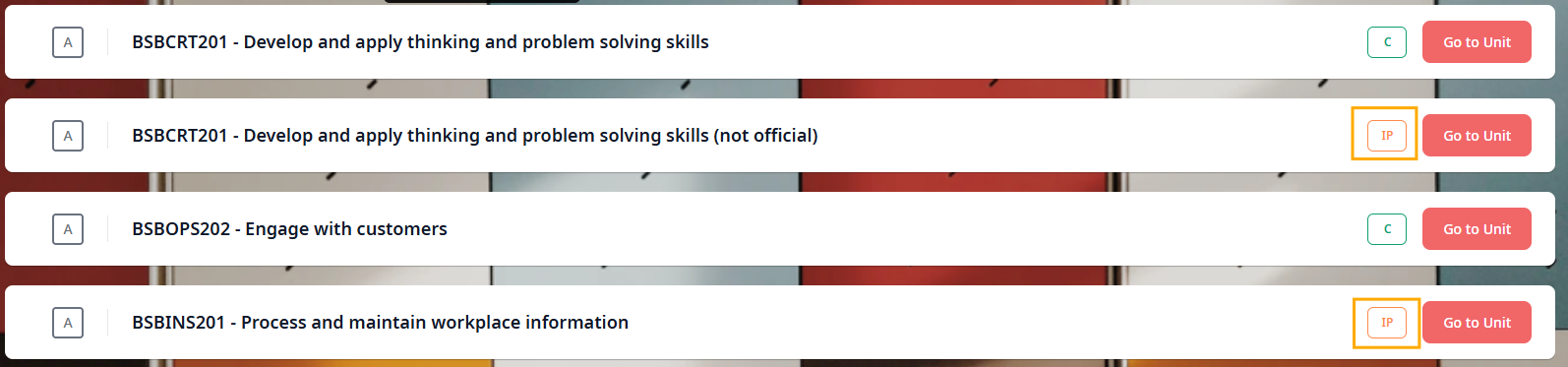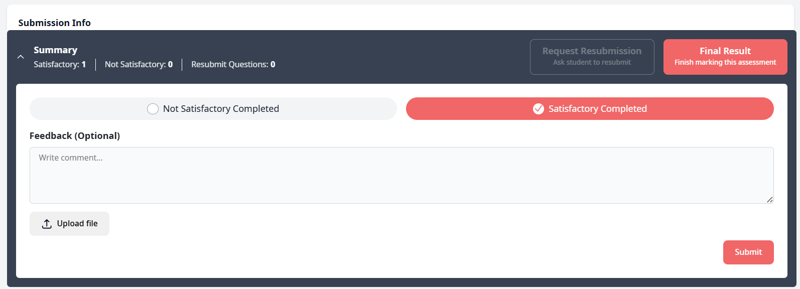Once the trainer finalises marking and assigns a result, the assessment shows Completed status with either Satisfactory (S) or Not Satisfactory (NS) outcome.