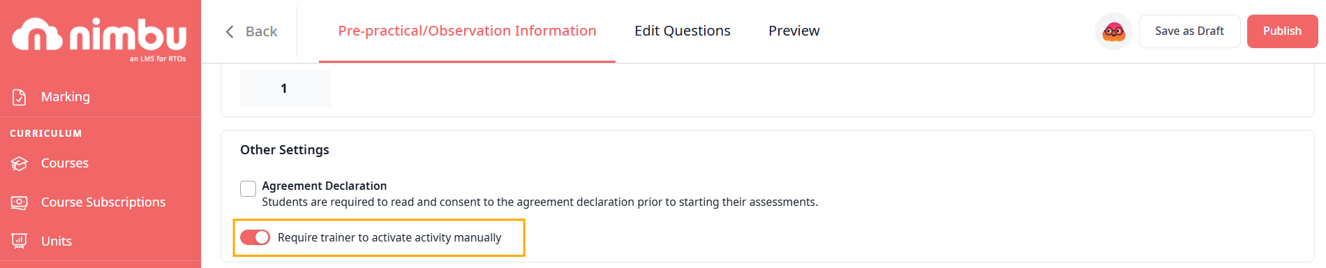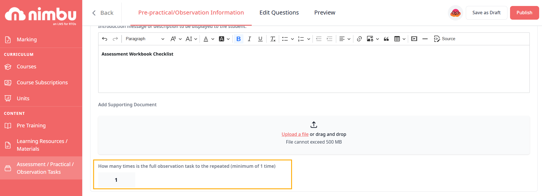 Practical skills often require multiple attempts, formal learner validation, or controlled release timing. Nimbu's Observation Settings allow you to customise the operational "rules" for how a practical task is delivered, repeated, and formalised. Whether you need to record a skill being performed multiple times across a semester, require a student to formally accept terms before beginning, or control when the observation becomes available, these settings ensure your records are as robust as your training delivery.