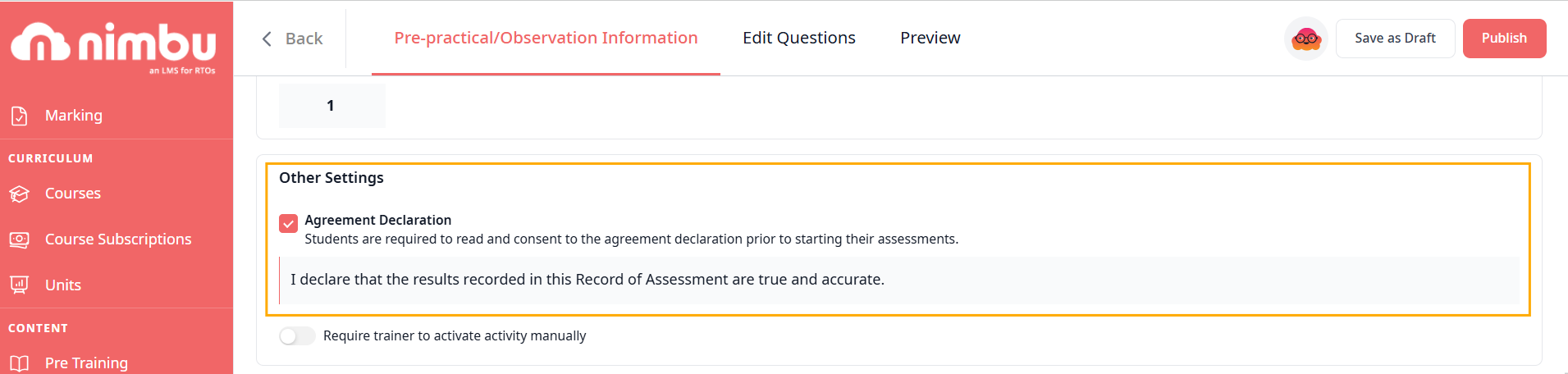 - Toggle "Require student to accept Agreement Declaration"