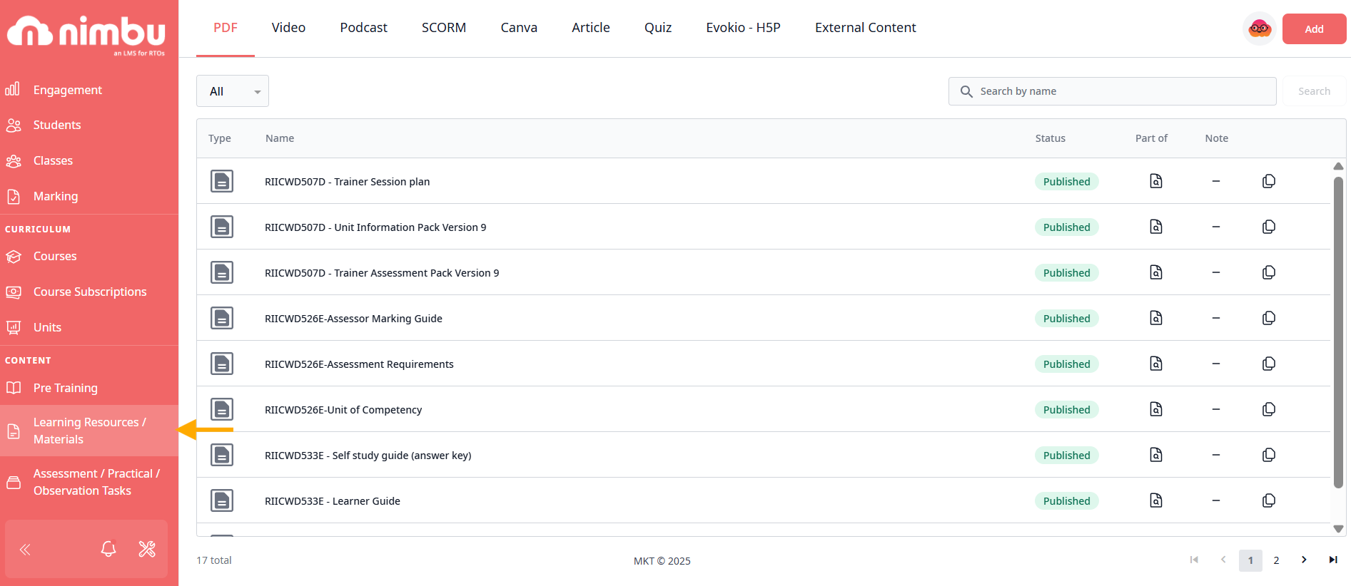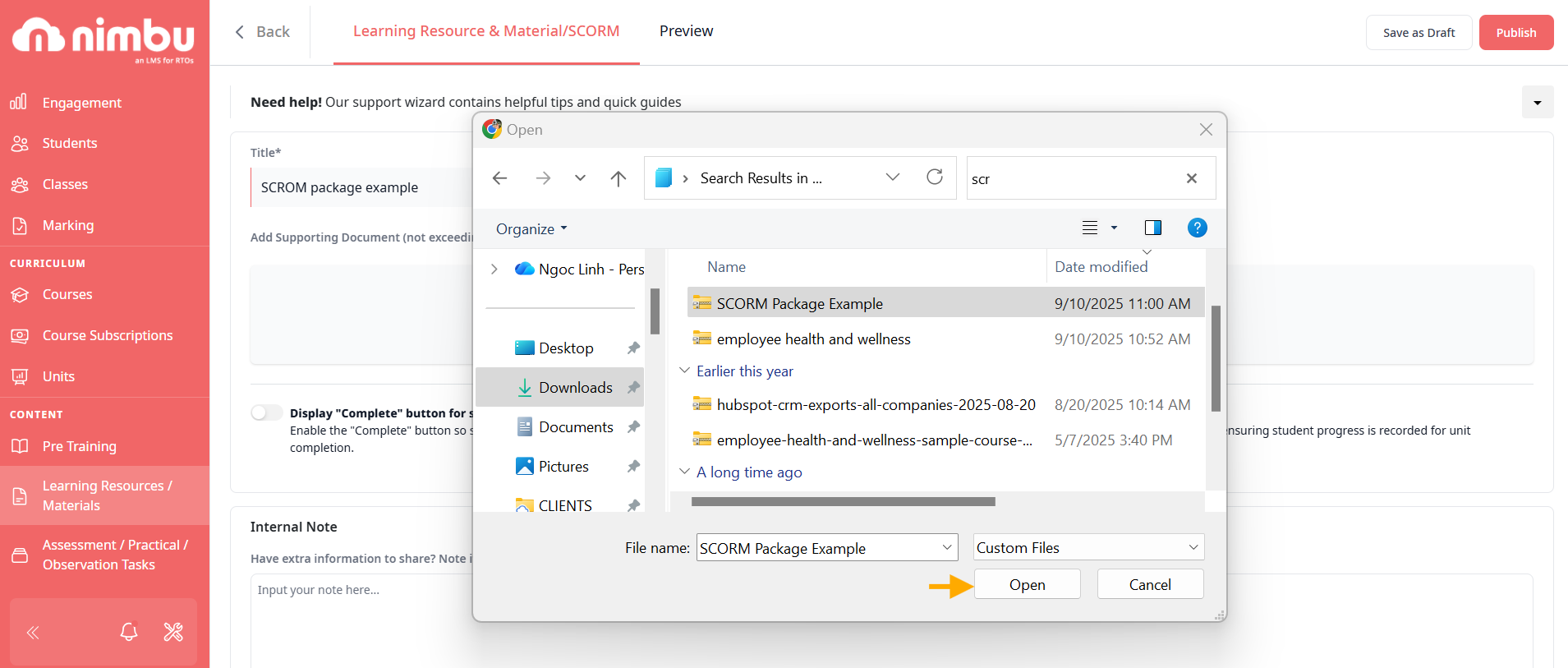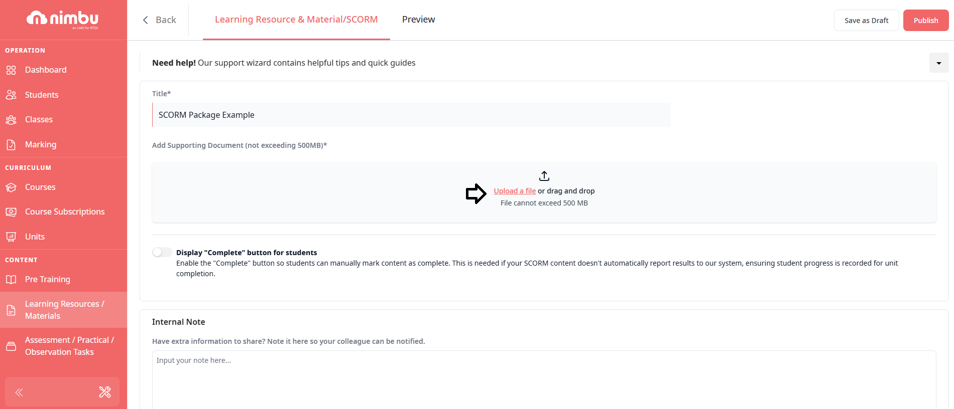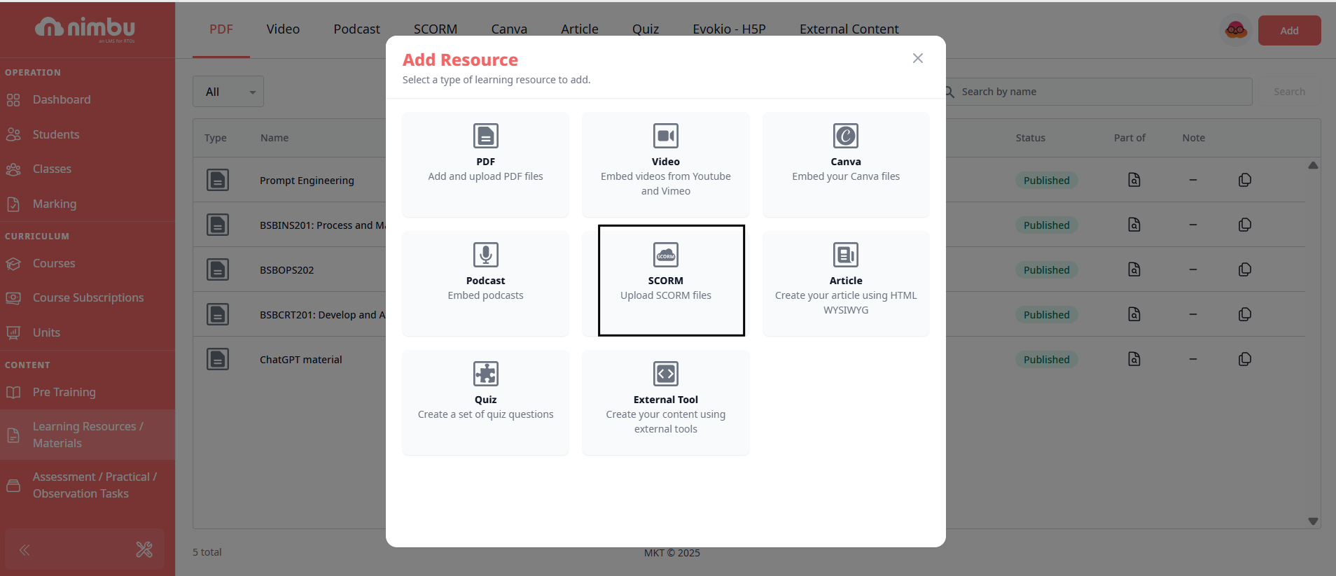SCORM (Sharable Content Object Reference Model) is the industry standard for interactive e-learning packages. Unlike static PDFs or videos, a SCORM file is a "smart" package that can contain quizzes, animations, branched learning paths, and interactive simulations. Importing SCORM files into your Content Library allows your Registered Training Organisation (RTO) to deliver sophisticated, engaging experiences that are consistent across all cohorts. Once uploaded, these packages become modular assets that can be mapped to any unit or used as references within assessments.