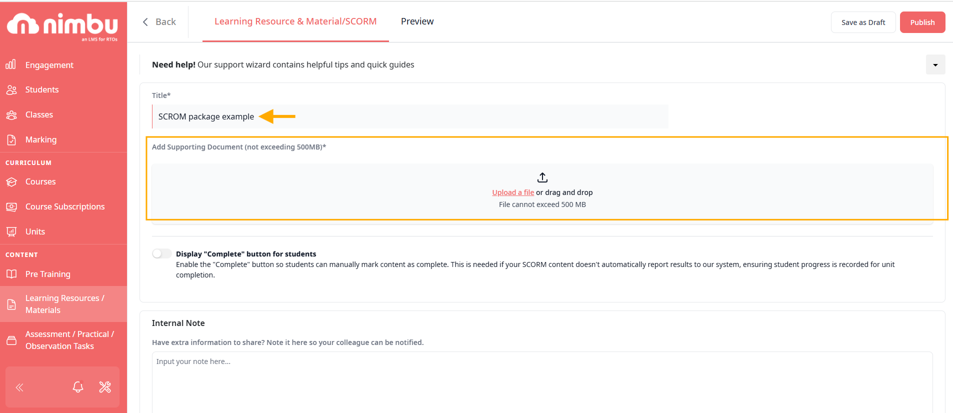 - Drag your SCORM zip file into the "Add Supporting Document" box, or