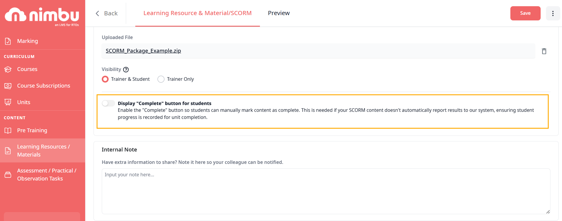 Note: Ensure your file is a valid SCORM package (typically containing an imsmanifest.xml file).
