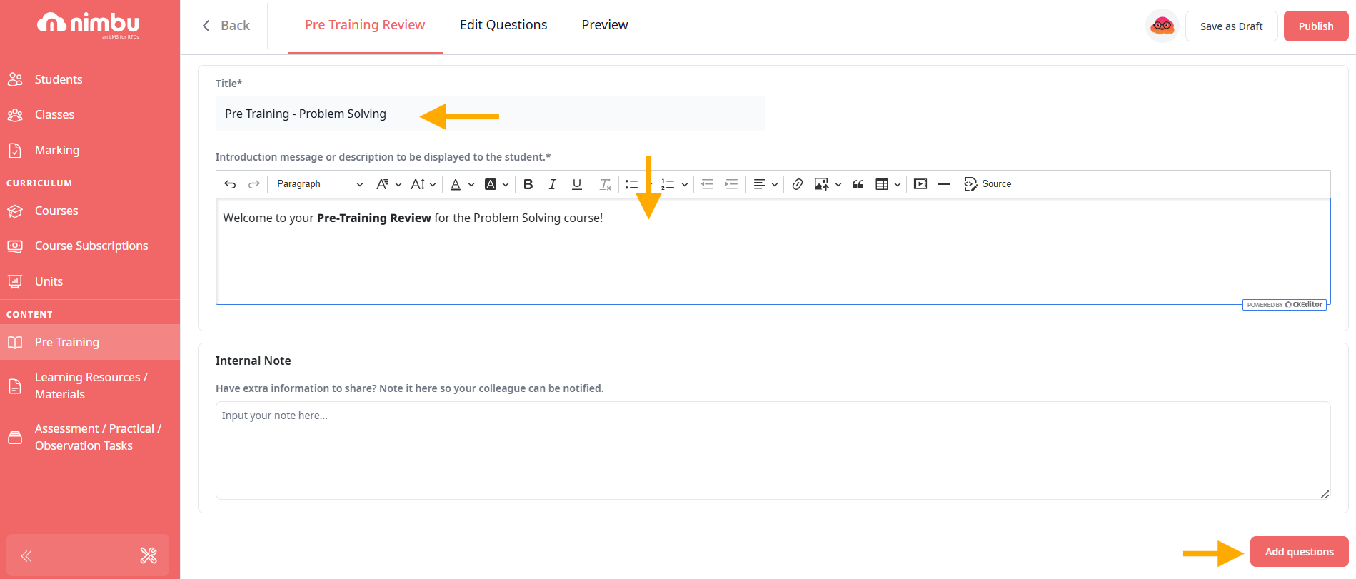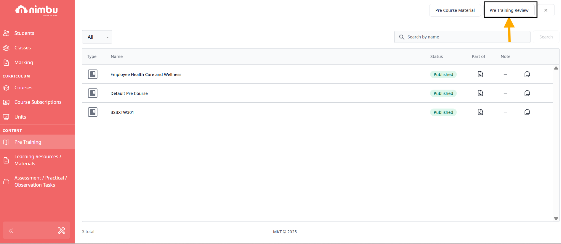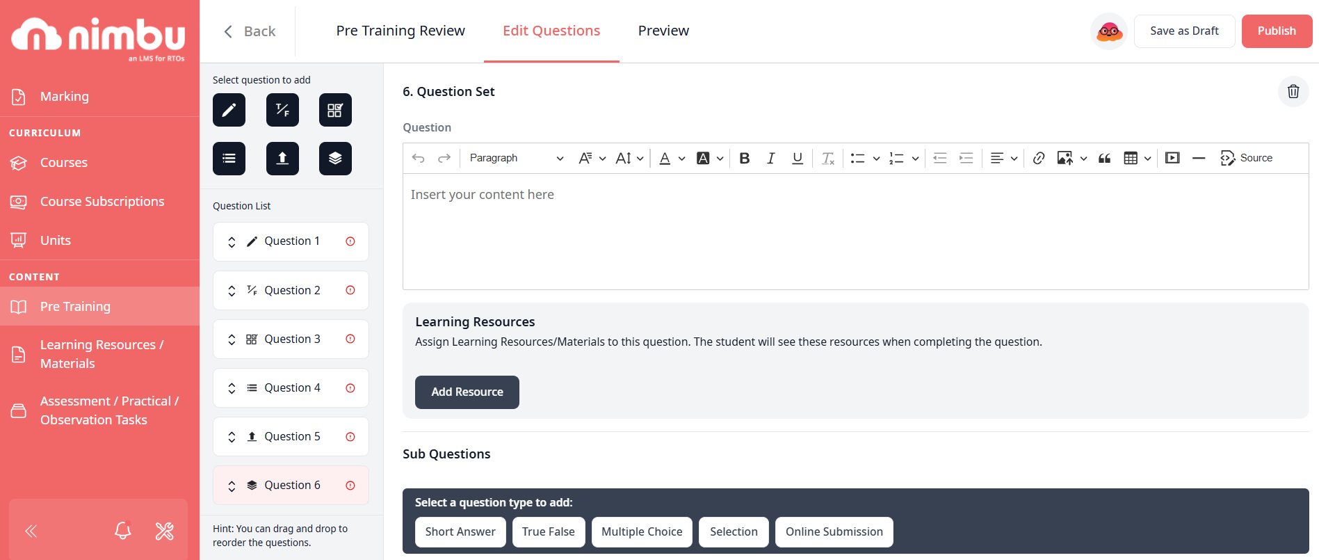 The Pre-Training Review (PTR) is a dual-purpose tool designed to prepare learners for an upcoming course. It allows you to deliver essential informational resources whilst simultaneously evaluating a student's foundational understanding through a targeted assessment. By requiring students to complete these tasks before the course starts, your RTO ensures a baseline level of competency and preparation across the entire cohort.