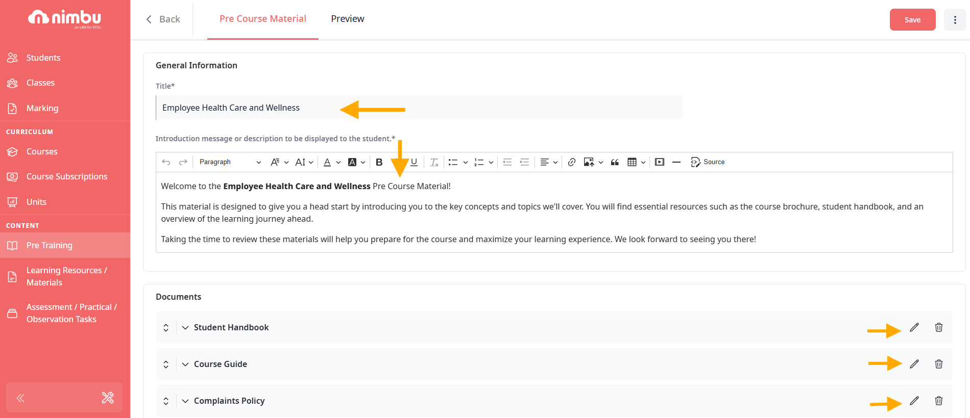 - Standardised Evidence Collection: By using the Pre-Course Material section, you can ensure students have received and acknowledged essential documents like student handbooks and course guides prior to starting their training.