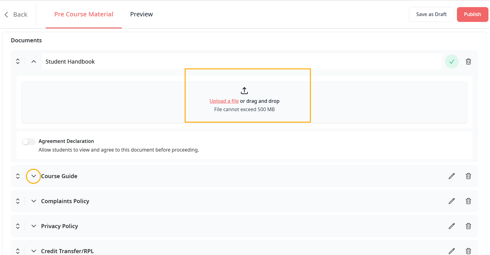 - Preview: Switch to the Preview tab to review how the document list and agreement toggles appear to the student.