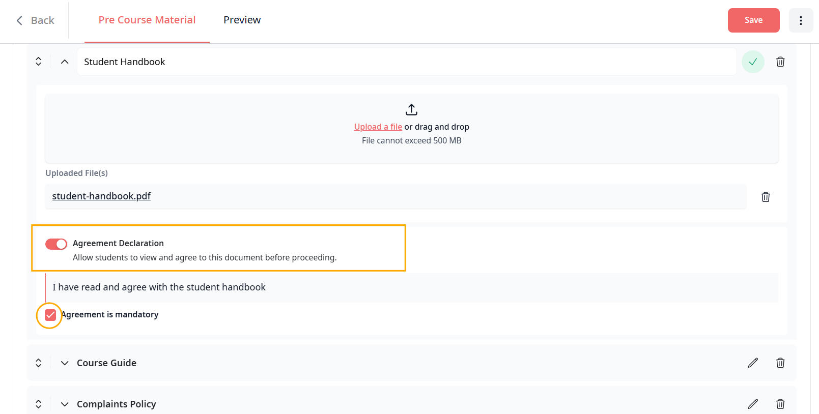 - Mandatory Status: Use this for critical documents like the Student Handbook or Code of Conduct to lock further progress until the declaration is met.
