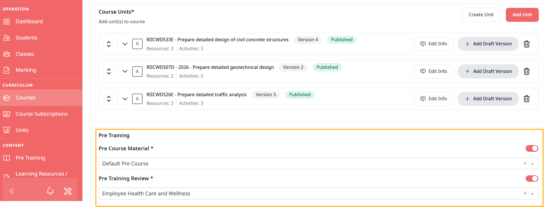 - Select your published Pre-Course Material and/or Pre-Training Review from the dropdown menus