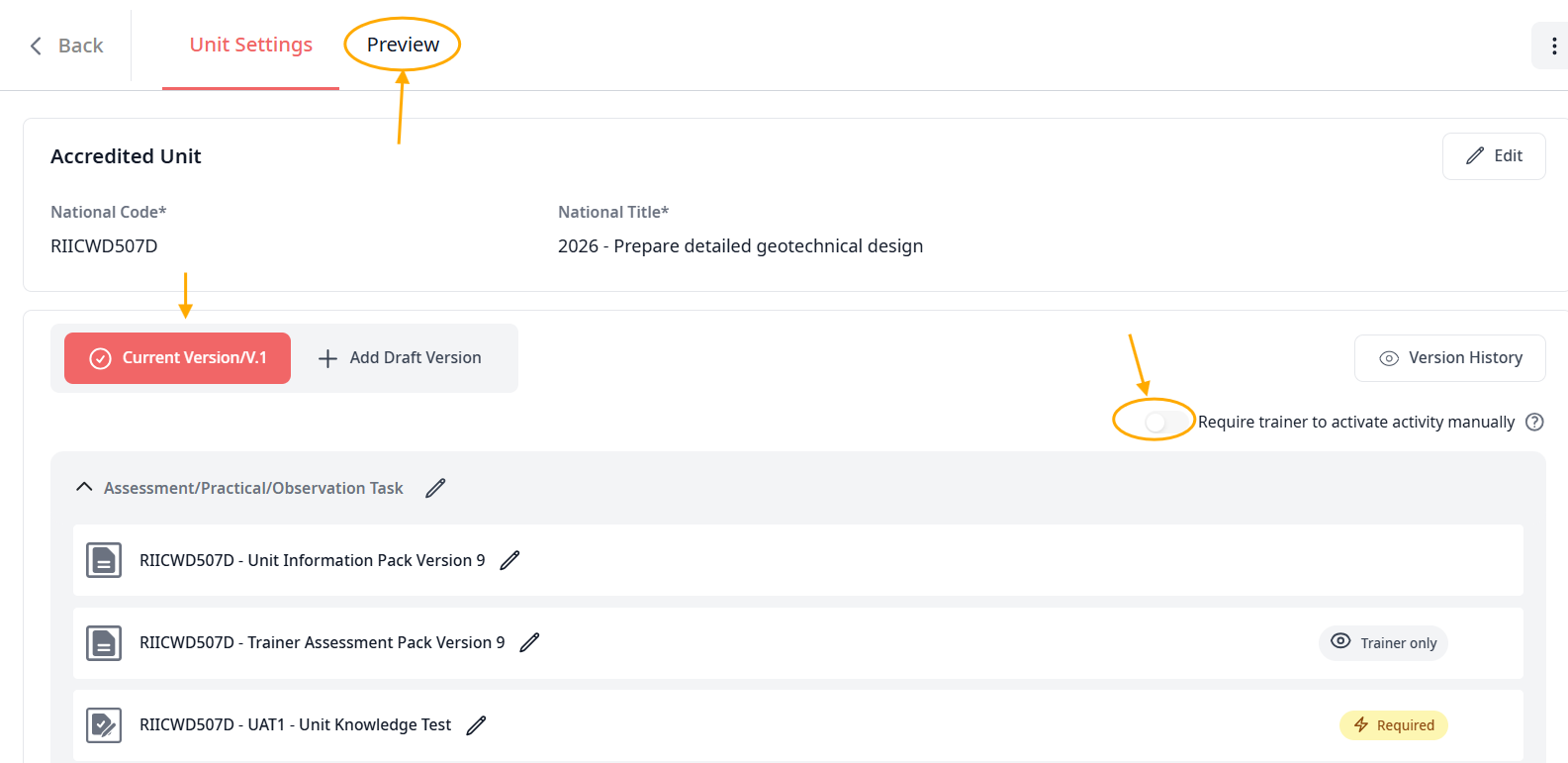 The Preview feature allows you to review exactly how unit content appears to different user types before publishing or making changes.