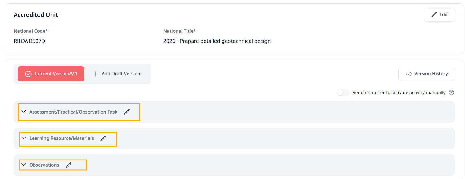 When you create a new Unit, two default sections are automatically provided to help you organise content: