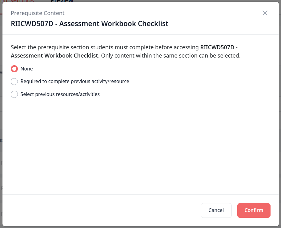 Sections within units can be configured to require completion of previous or selected sections before unlocking, creating structured learning pathways.