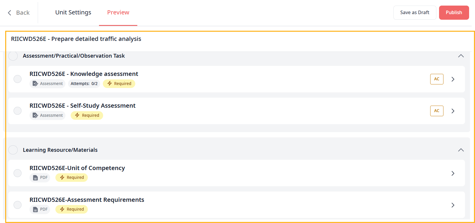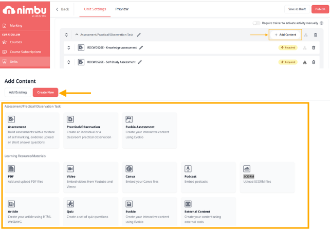 Units are the fundamental building blocks of your curriculum in Nimbu. They contain all the learning resources and activities students need to achieve specific competencies or learning outcomes. This guide walks you through creating a unit from scratch, adding content, organising materials into sections, and publishing your unit for delivery. Whether you're building an accredited unit of competency or a custom training module, this step-by-step process ensures your unit is structured, complete, and ready for students.