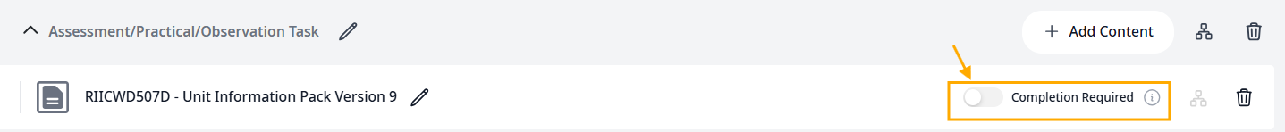 Completion Required is a toggle set on individual content items within a section, not on the section itself. It determines whether a student must complete a specific resource or activity for it to count toward finishing the section.
