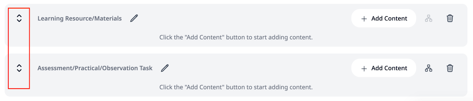- Move Sections: Sections can be rearranged within a unit using drag-and-drop. Click and hold the drag handle on a section, then move it to the desired position.
