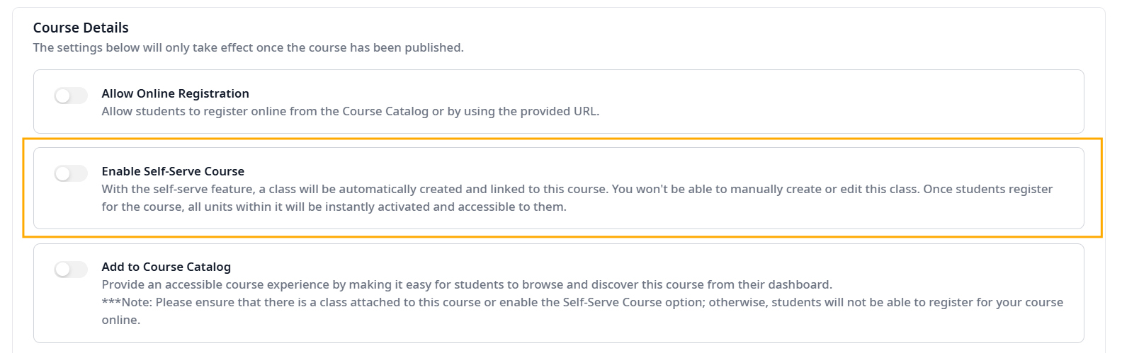 - Self-Served cannot be enabled if the course already has existing classes. The setting is only available during initial course configuration, before any classes exist.