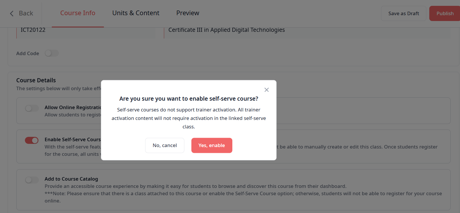 Pro-Tip: If you enable the Self-Serve option, any content previously set to "Trainer Activation Required" will be overridden and will not require manual activation.