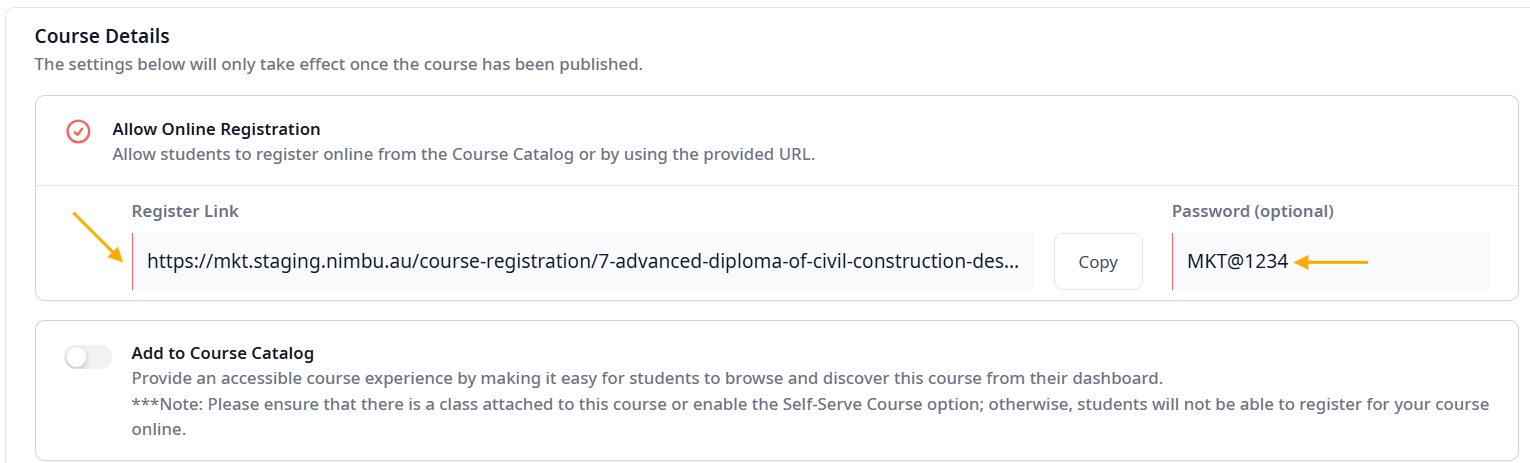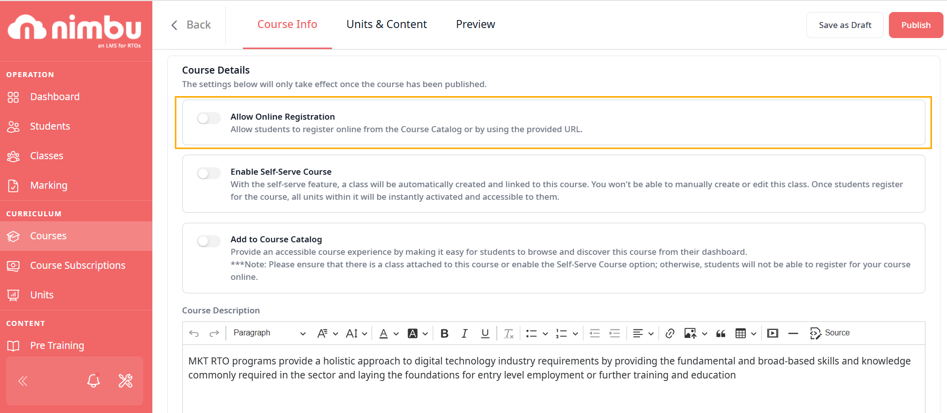 When you toggle Allow Online Registration to on, Nimbu makes the course available for external sign-ups. Students can register through your RTO's Course Catalog or via a direct link you distribute to your audience.