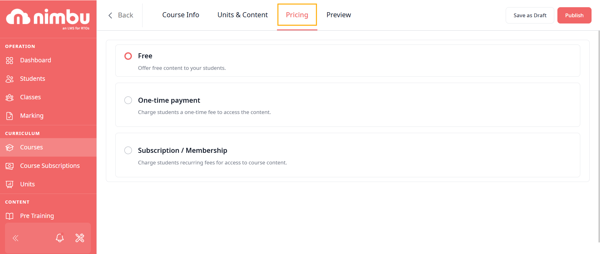 Nimbu offers three pricing modes for courses with Online Registration enabled. Select the mode that best suits your delivery model.