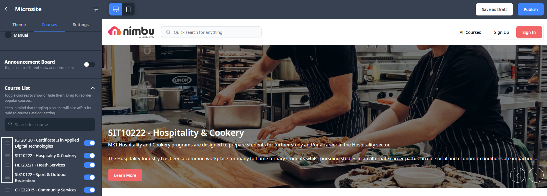- Use the drag-and-drop handles to arrange courses in the order you want them to appear to students.