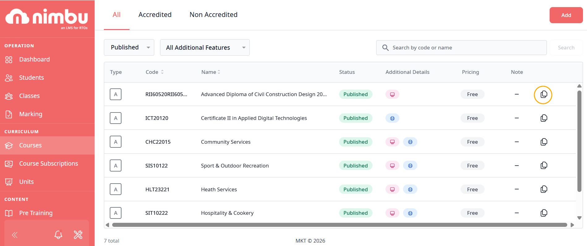 - The Action: In the main Course Registry, locate the overlapping squares icon (Duplicate) on the far right of the course row.
