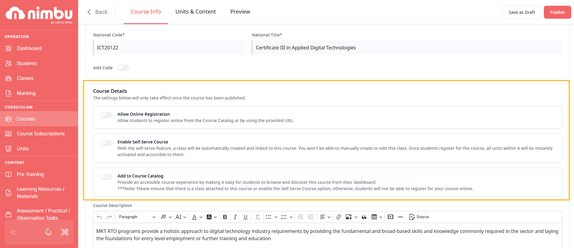 Note that not all configuration options live in the Settings menu. Certain course-level toggles — such as Online Registration, Self-Served, and Pricing — are found directly within the Course Info and Units & Content tabs of individual course templates.