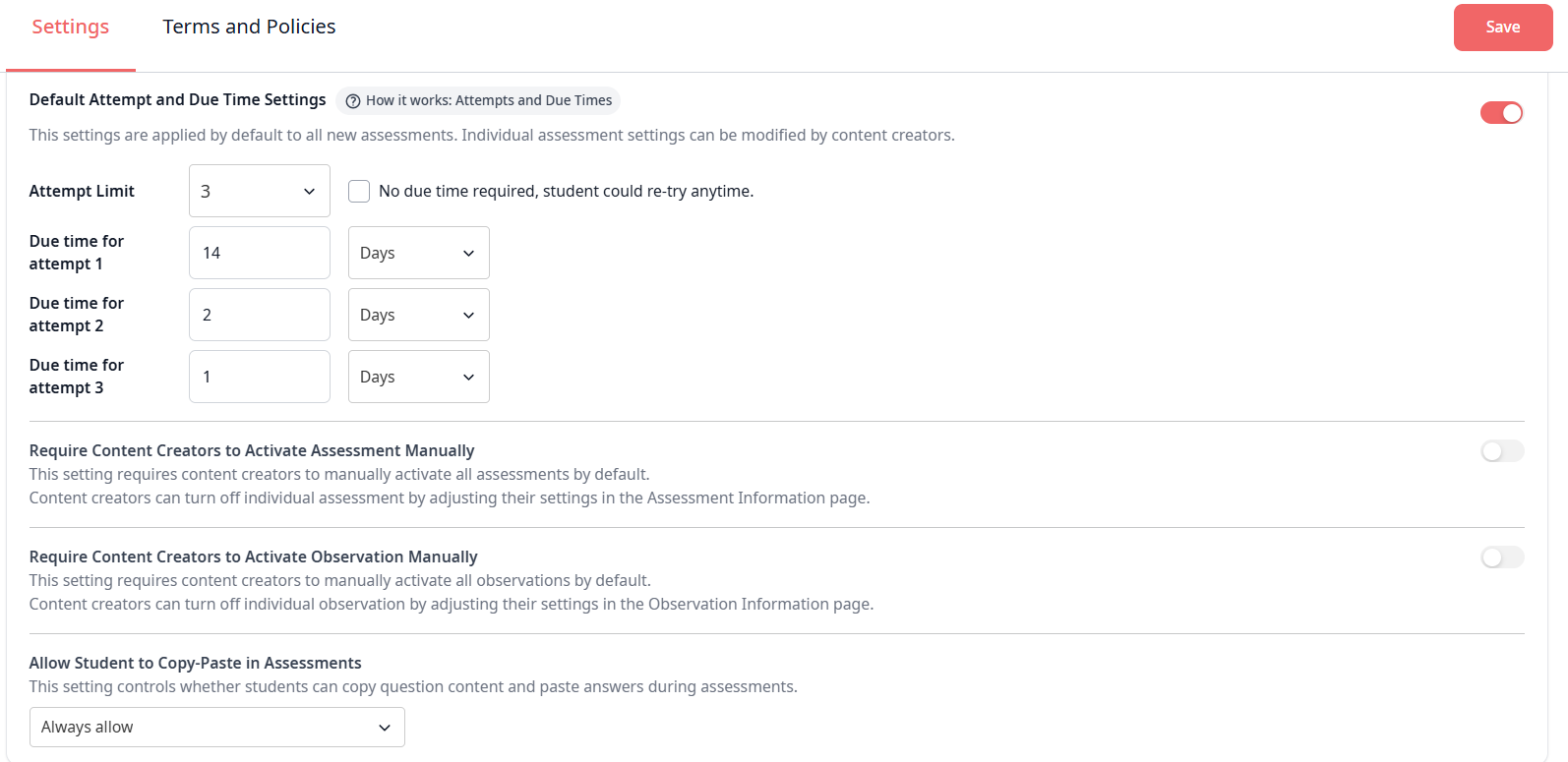 - Attempts & Due Times: Configure the standard number of attempts a student receives for assessments with self-marking questions, and set the default timeframe allowed for each attempt. These defaults apply to all new assessments unless overridden at the individual assessment level.