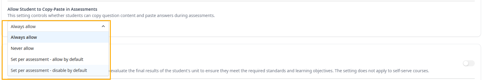 - Copy/Paste Behaviour: Control how students interact with question text and answer fields during assessments. This setting uses a dropdown with four options: