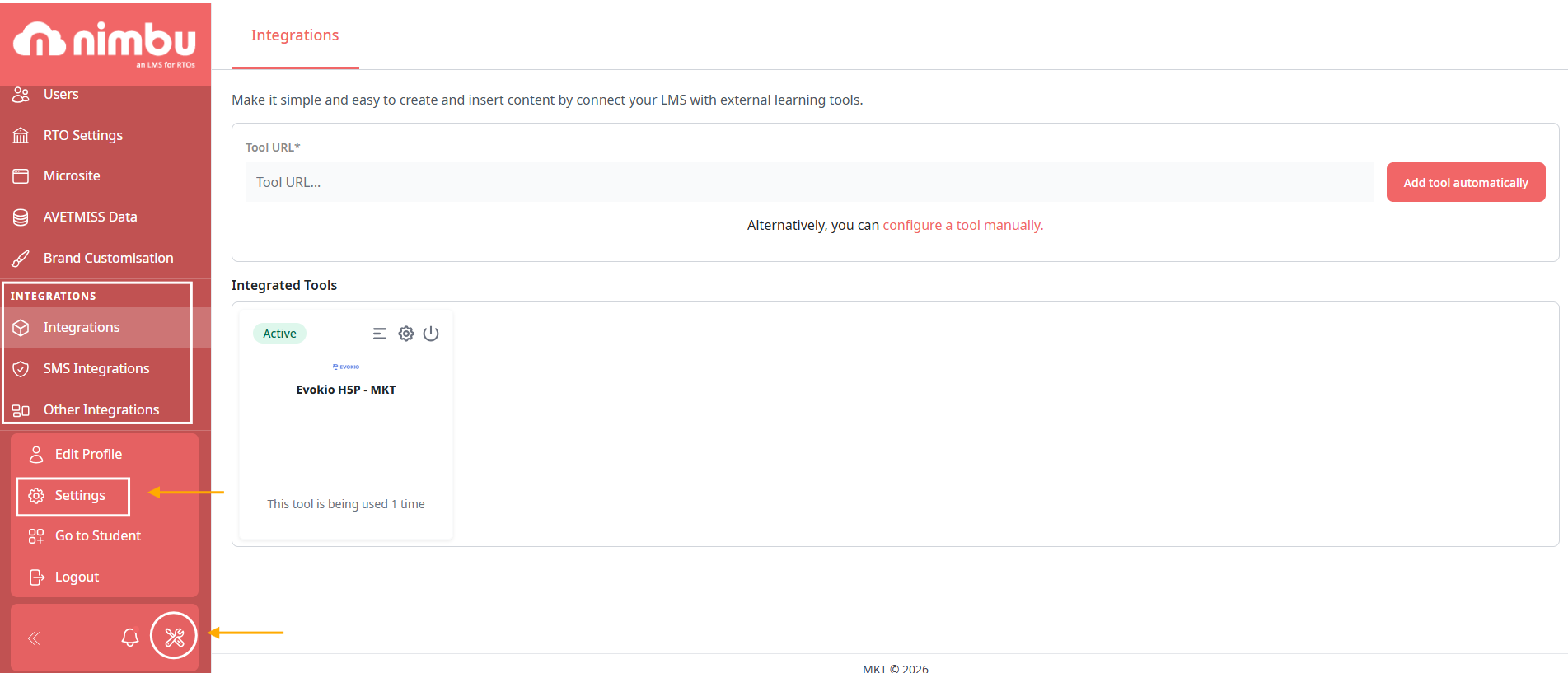 - LTI 1.3 (Learning Tools Interoperability): The industry standard for connecting external learning tools directly within Nimbu. LTI allows you to launch third-party interactive content, such as Evokio activities, inside the Nimbu interface, with grades and completion data automatically passed back to the Nimbu gradebook. LTI tools are connected using a registration URL or manual configuration details provided by the tool provider.