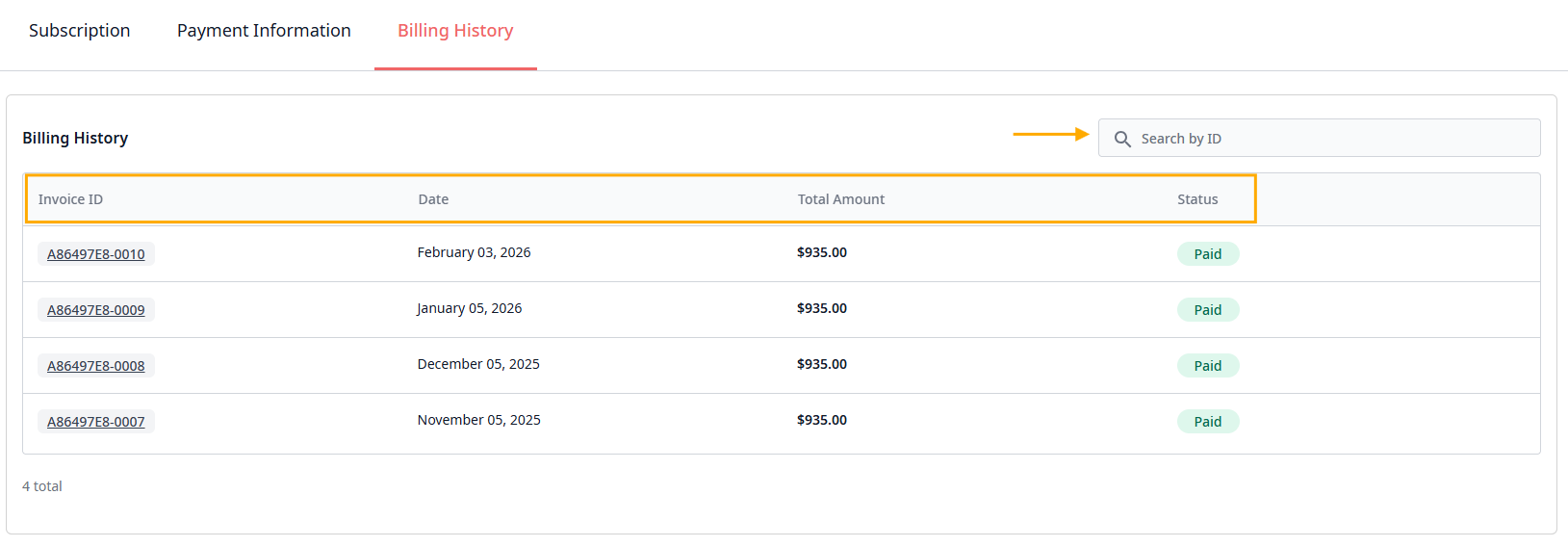 - Search Functionality: Use the "Search by ID" bar to quickly locate a specific transaction using its unique Invoice ID (e.g.,