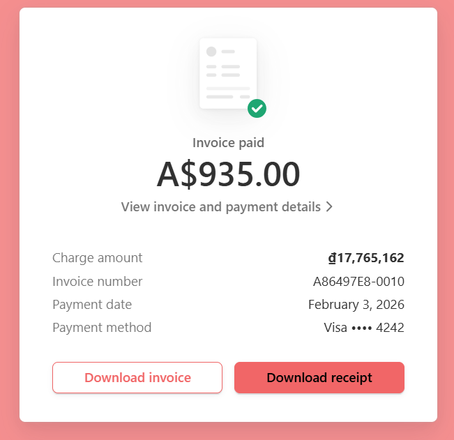 - Invoice: A formal PDF document including your organisation's billing details and itemised plan costs.