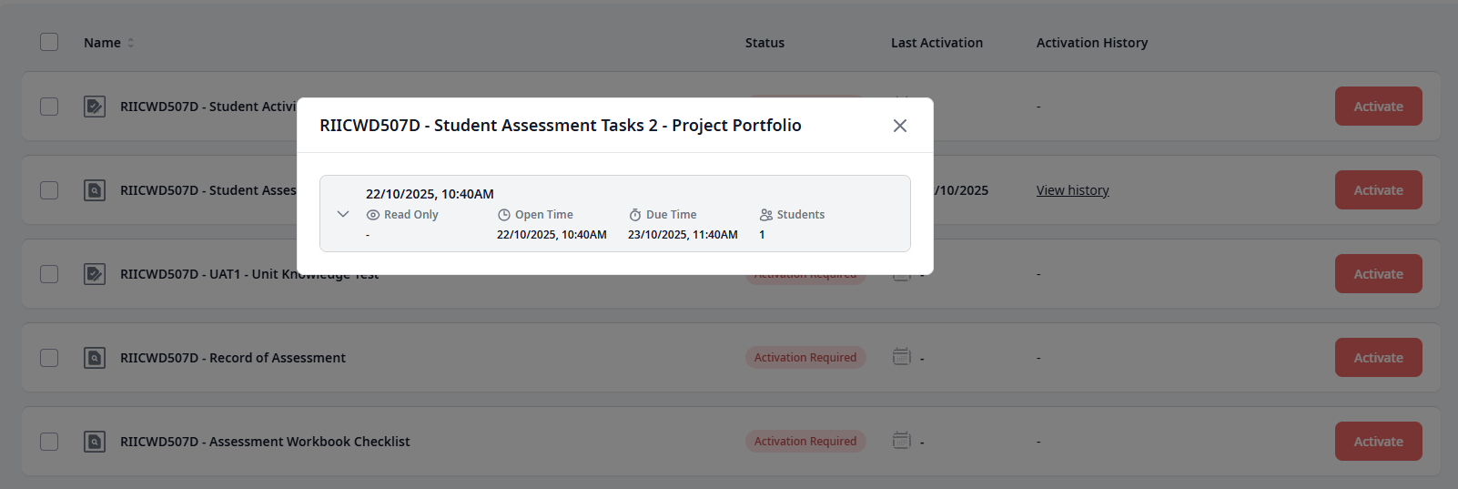 - Activate Individual Content: Once the unit is active, trainers can activate specific assessments or observations within it, with full control over timing and access windows.