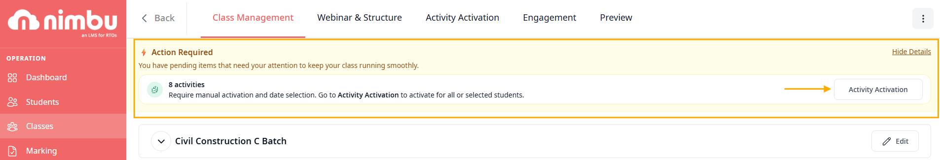 Quick Access from Class Management: If any activities are pending activation, an Action Required banner appears at the top of the Class Management tab. The banner lists the number of activities requiring attention and includes a direct link to the Activity Activation tab, so you can get there without navigating manually.