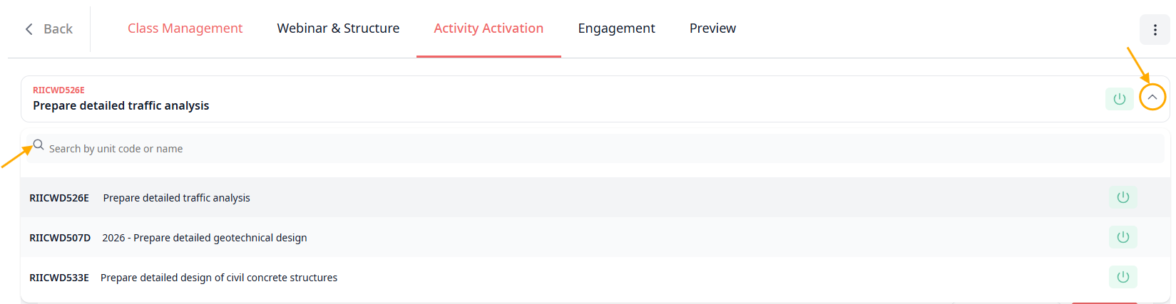 - All units in the class are listed by their national code and title. Use the search bar to find a specific unit by code or name, or scroll through the list.