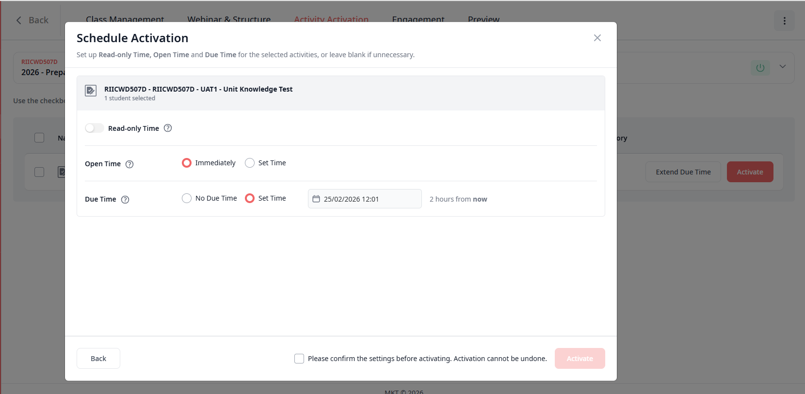 After clicking Activate, select one or more students — a Schedule Activation modal will then appear, trainers can configure how and when students interact with it.
