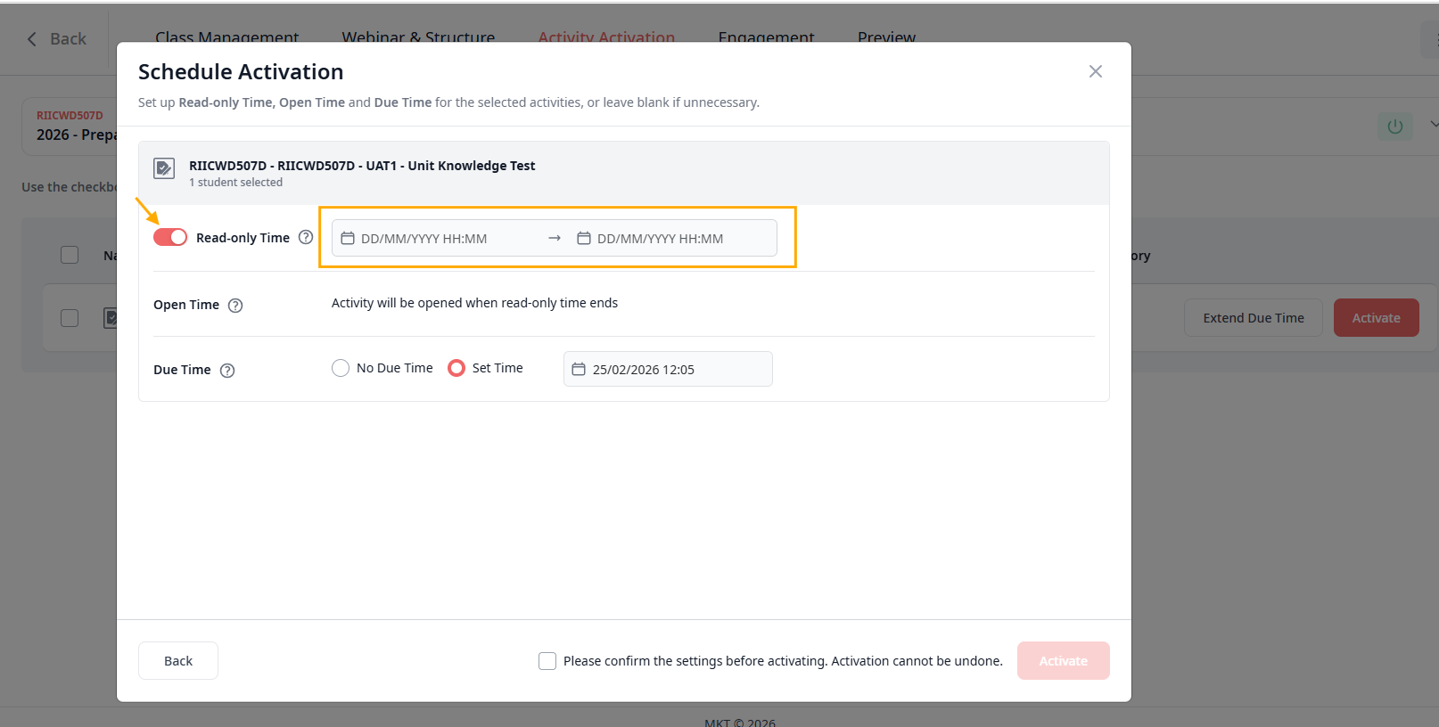Read-only Time (toggle): Enable this toggle to allow students to view the activity before it officially opens. During this period, students can read the content but cannot interact with or submit it.