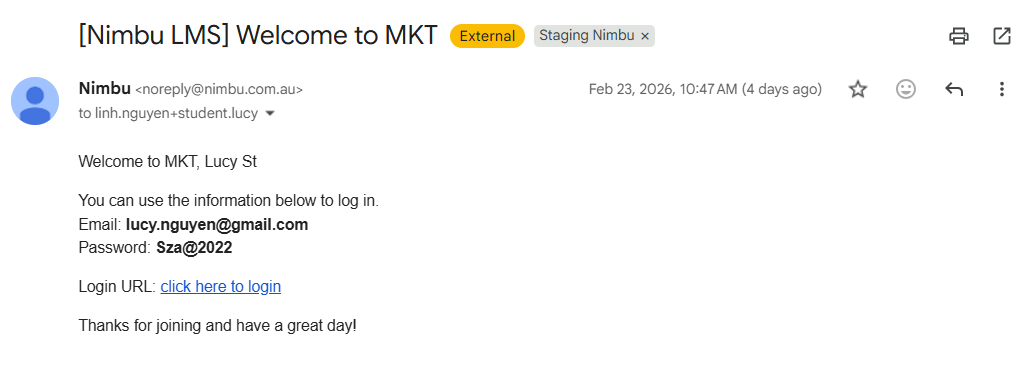 When your RTO adds you to an active class, Nimbu automatically sends a welcome email to the address your trainer or administrator has on file.