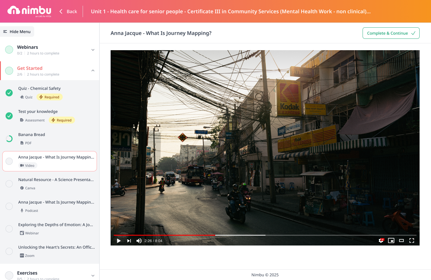 If the video is set as completion-required, a Complete button will appear after you have opened the resource. Click Complete & Continue to mark the video as done.