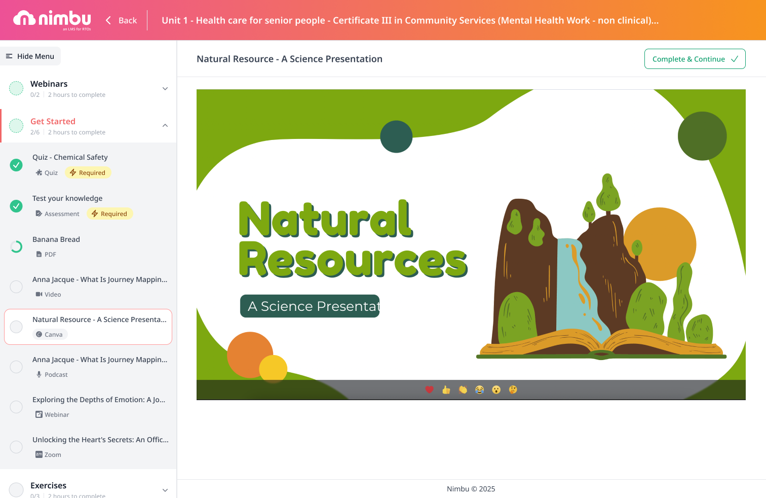 - Optional resources : If a resource has not been set as completion-required, it will not show a Complete button and does not affect your unit progress, though you are still encouraged to review it.