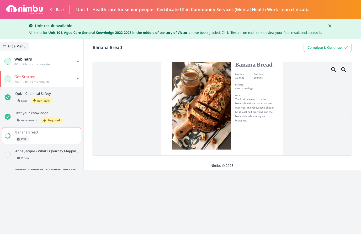 If your trainer has set the PDF as completion-required, a Complete button will appear once you have opened it. Click Complete & Continue to mark it as done and update your progress. This may also unlock the next item in your section if a prerequisite is in place.
