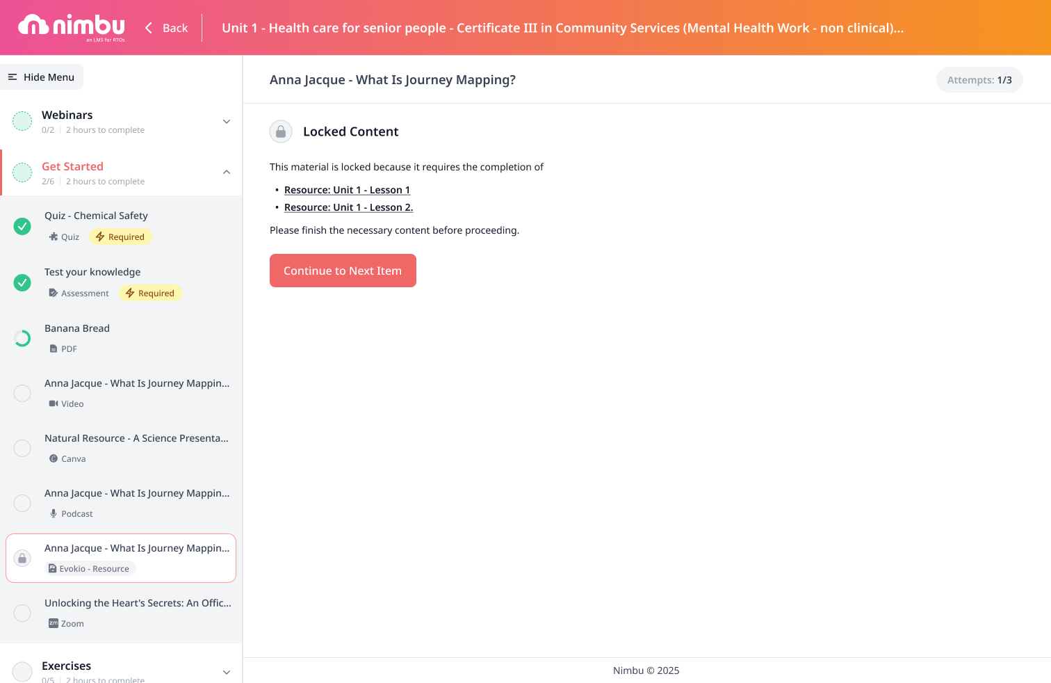 Your RTO may configure certain resources so that they must be completed before the next item in a section becomes accessible. This is called a prerequisite, and it ensures you engage with foundational materials before moving forward.