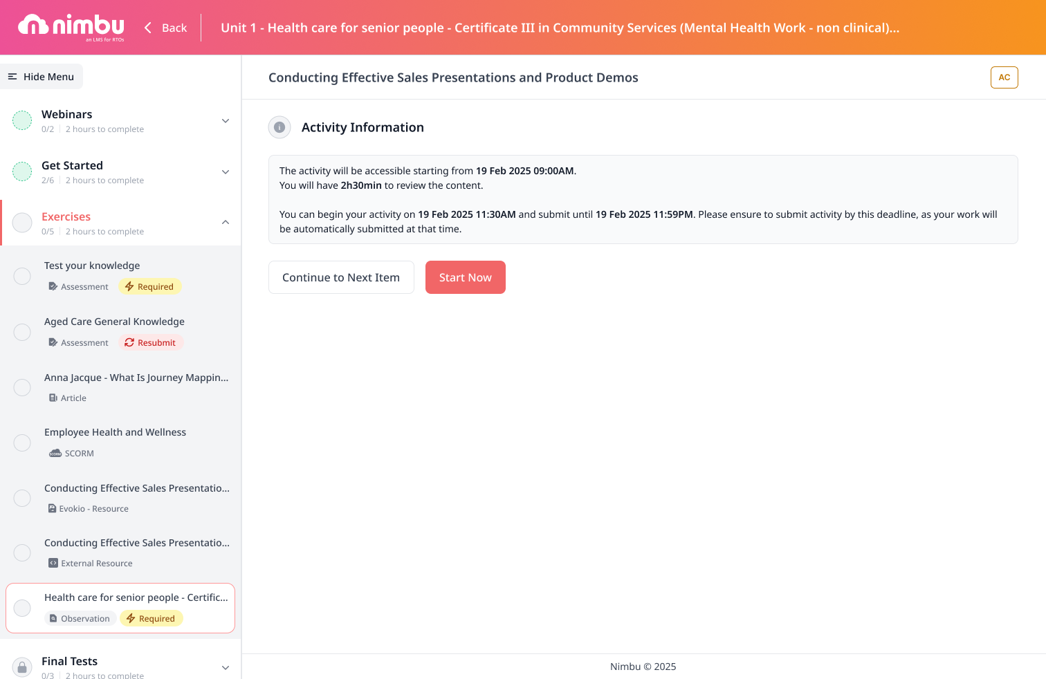 Observations are a type of practical assessment that allows your trainer to evaluate your competency in a skill or task. Rather than answering a theory test, you are assessed on your ability to perform, demonstrate, or document real activities. Nimbu uses two types of observations, and the one you encounter will determine what is expected of you.