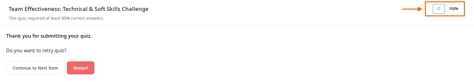 | Not Passed | Your score did not reach the pass threshold. If the quiz is completion-required, it remains incomplete until you reach the threshold on a retry. |