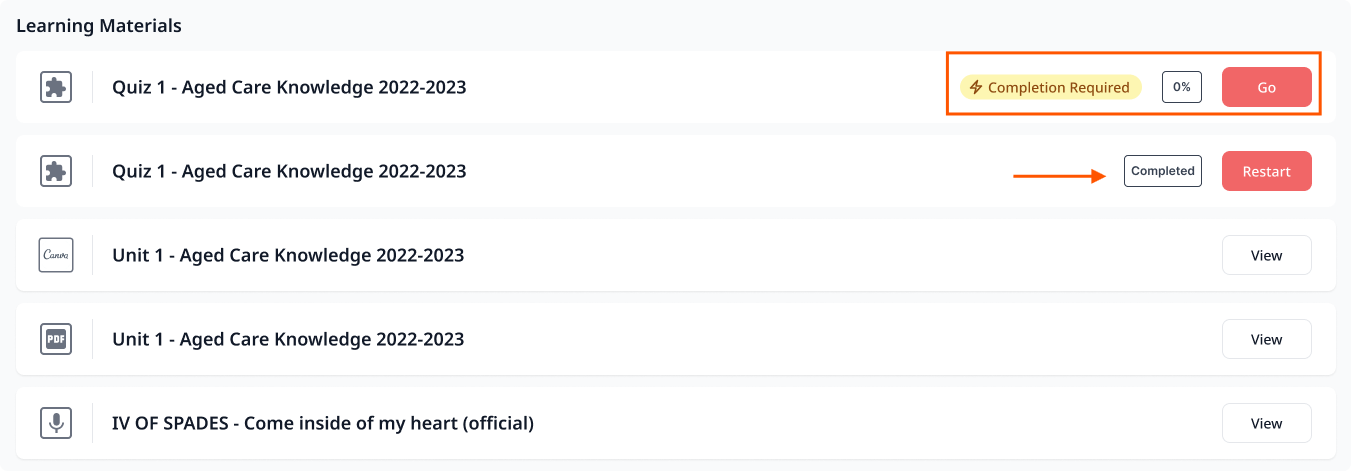 Some quizzes are set as completion-required by your RTO. If this applies, you must reach the pass threshold before the quiz is marked as completed, and any content or activities that depend on it will remain locked until you pass. A "Required" badge will appear on the quiz in your unit view to indicate this.