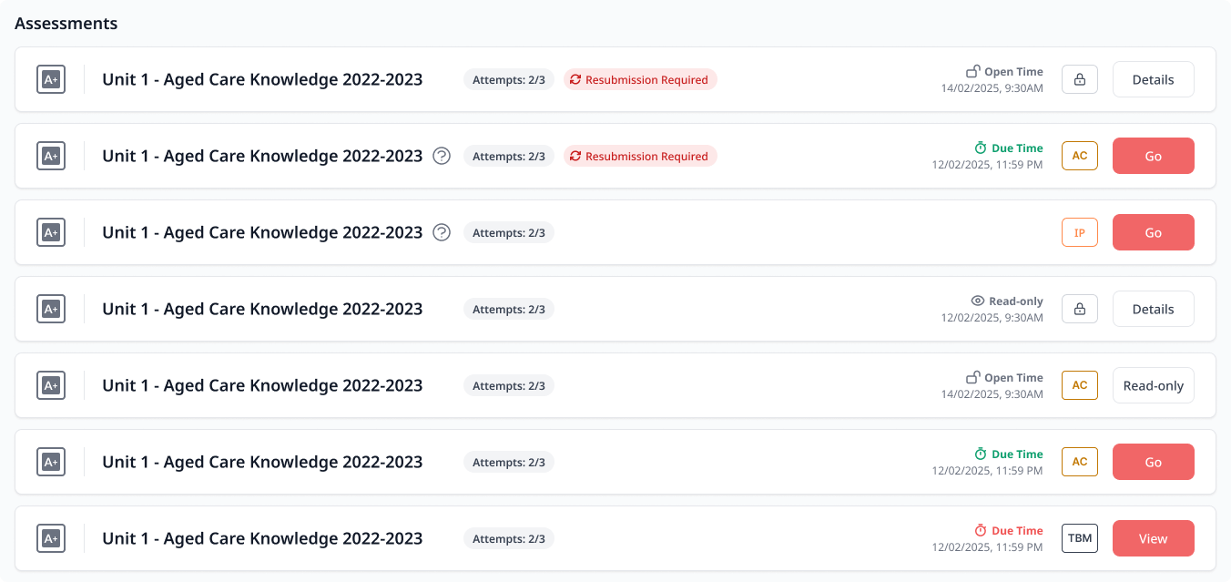 Once you have completed all required content in a unit, your trainer assigns a final unit result. This is the overall competency outcome for that unit and sits above the individual activity results.