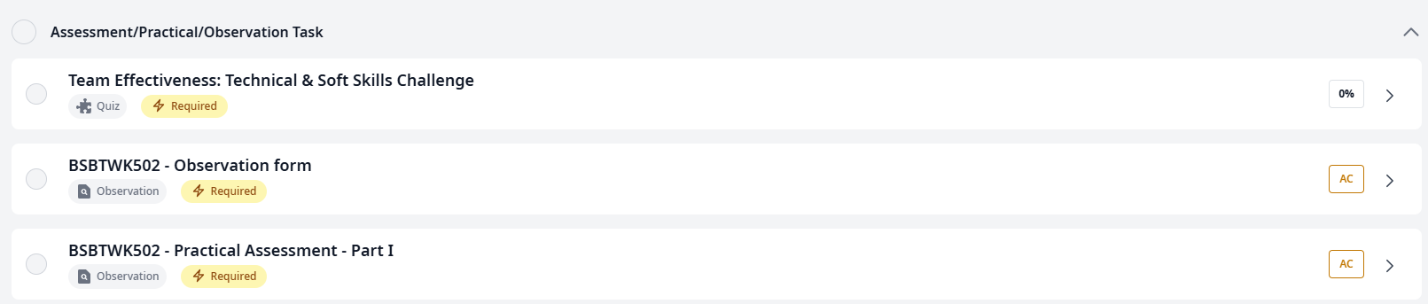 Your unit progress is driven by completion-required content: the activities and resources your RTO has designated as mandatory. These are marked with a "Required" badge in your unit view and include all assessments and observations, as well as any learning resources your RTO has flagged.