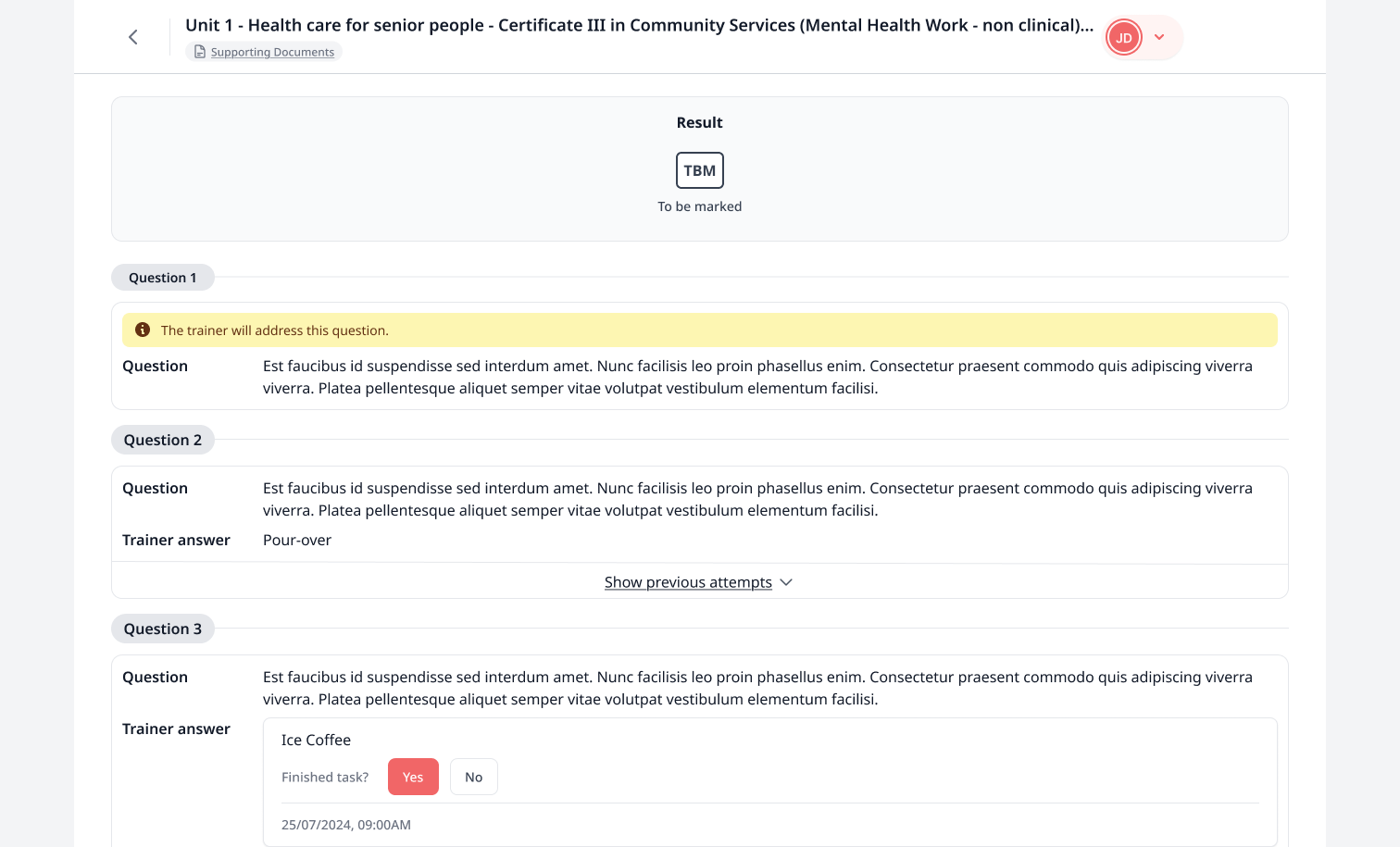 - Activity feedback : Open the relevant assessment or observation from your unit and navigate to the marking summary or result screen. Trainer feedback appears alongside your result.