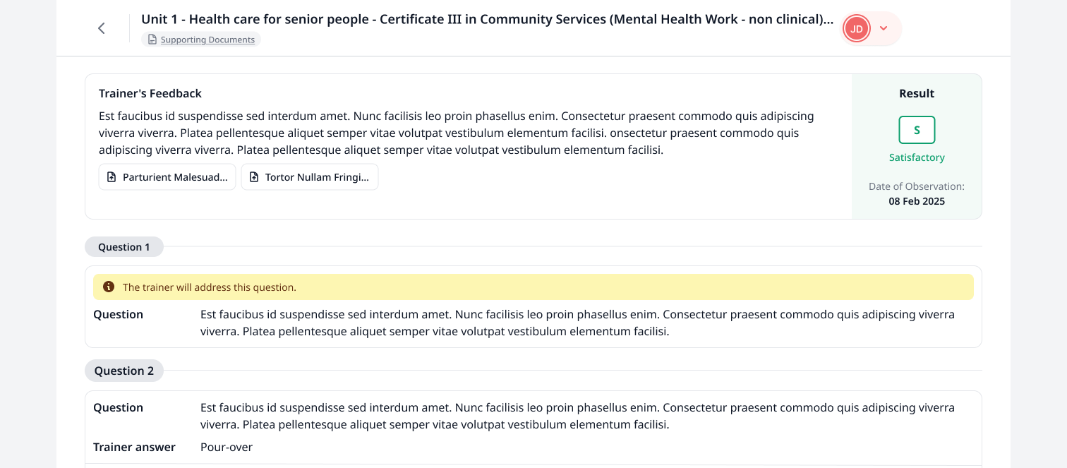 Your trainer may leave written feedback alongside the result for any assessment, observation, or unit. This feedback is a direct communication from your trainer about the quality of your work, areas of strength, and areas that need improvement.