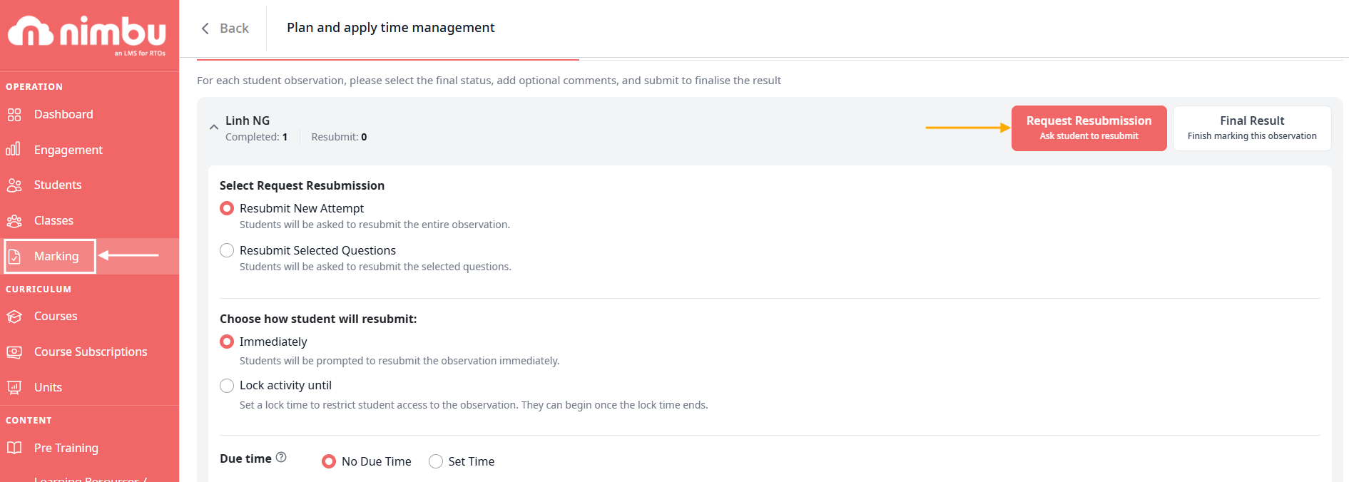 When a student's submitted work doesn't meet the required standard, trainers can send a resubmission request rather than finalising a Not Satisfactory result. Resubmission gives the student an opportunity to improve their work, either by redoing the entire task or by addressing only the specific questions that need improvement. Trainers can configure when the resubmission becomes available, attach feedback, and set a deadline for the new submission.